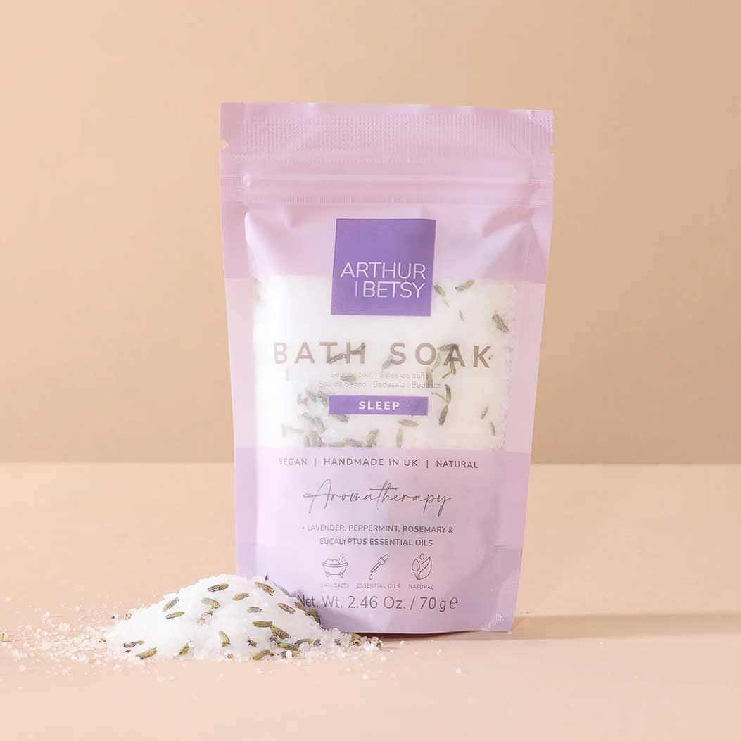 The sleep bath soak contains: Epsom salt, lavender buds, lavender essential oil, peppermint essential oil, eucalyptus essential oil and rosemary essential oil.
