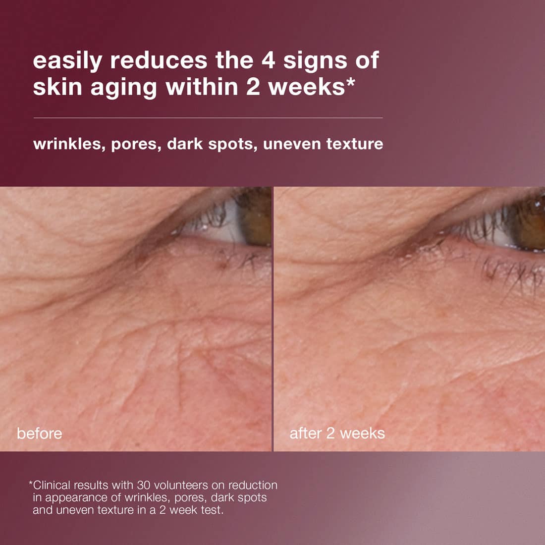*Clinical results with 30 volunteers on reduction in appearance of wrinkles, pores, dark spots, and uneven texture in 2 week test.