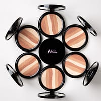 Lightly swirl your Mii finishing brush into powder and apply in gentle, circular motions to cheeks and temples. Swirl your brush over all shades for a beautiful shimmering blush, or use individual shades as a highlighter or blusher.