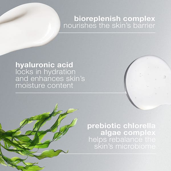 What are the key active ingredients? – BioReplenish Complex (barrier lipids), prebiotic Chlorella Algae, Hyaluronic Acid, Echinacea, Centella Asiatica, Aloe Vera and Lactic Acid (AHA).