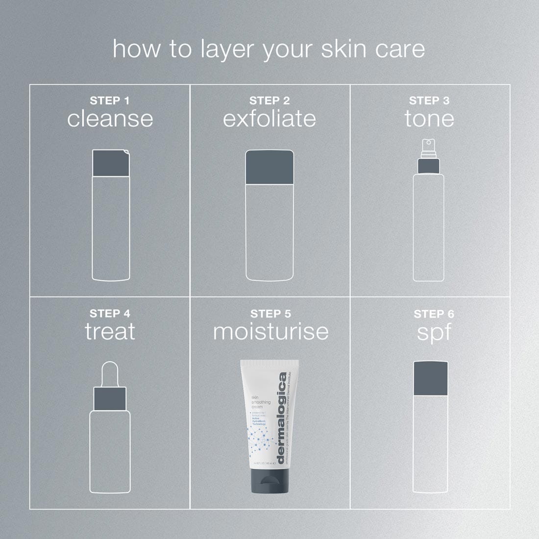 - Dispense an almond sized amount of Skin Smoothing Cream and apply to damp skin in light upward strokes. Include the neck.